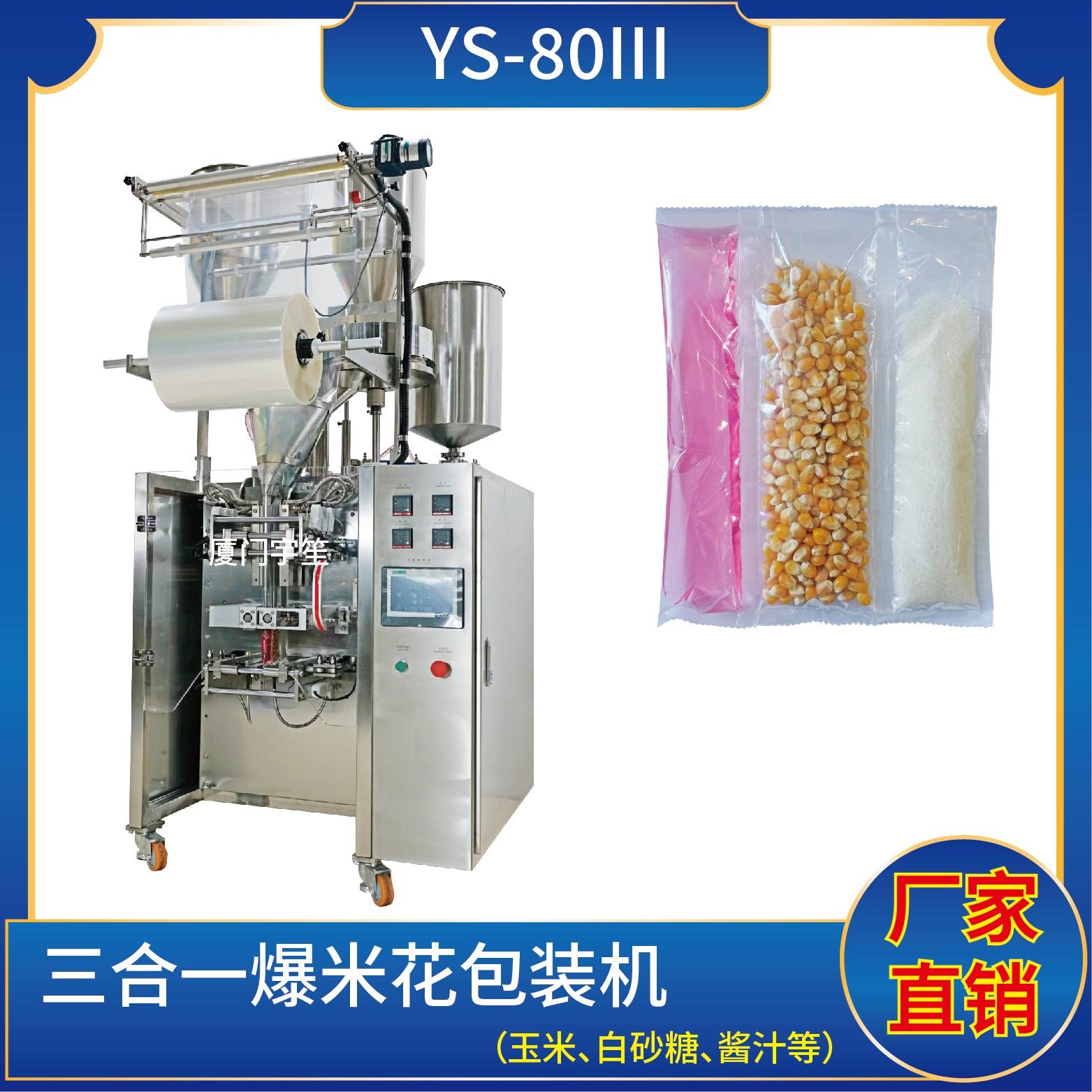 YS-80三列 三合一爆米花包裝機(jī)(使用鍍鋁、塑膠膜包裝)特點(diǎn):1、適用于食品、醫(yī)藥、化工、化妝品行業(yè)中顆粒、粉劑、液體、醬料等物品的計(jì)量包裝。2、可自動完成制袋、計(jì)量、下料、封合、分切、計(jì)數(shù),可根據(jù)客戶要求配置打印批號等功能。3、觸摸屏操作,PLC控制,伺服電機(jī)控制袋長,性能穩(wěn)定、調(diào)整方便、檢測準(zhǔn)確。智能式溫…