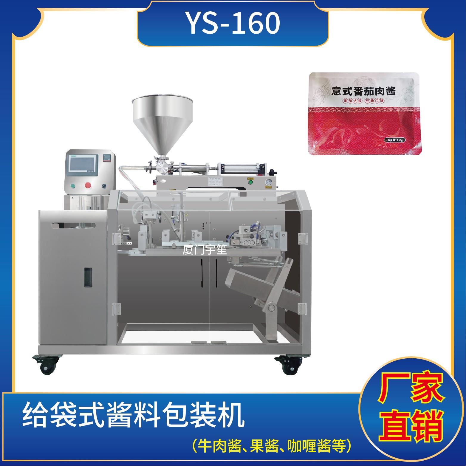 YS-SP160水平給袋式醬料包裝機(jī) (使用鍍鋁、塑膠膜包裝) 1、適用于食品行業(yè)顆粒、粉劑、液體、醬料等物品的計(jì)量包裝。2、包裝流程全自動,無需人工操作。可根據(jù)充填物料的性質(zhì)選配不同的下料結(jié)構(gòu)。3、采用觸摸屏操作,PLC控制,封口溫度自動補(bǔ)償,控溫精準(zhǔn),封口美觀大方。4、下料方式:依據(jù)客戶需求選配。5、封口形式:預(yù)置…